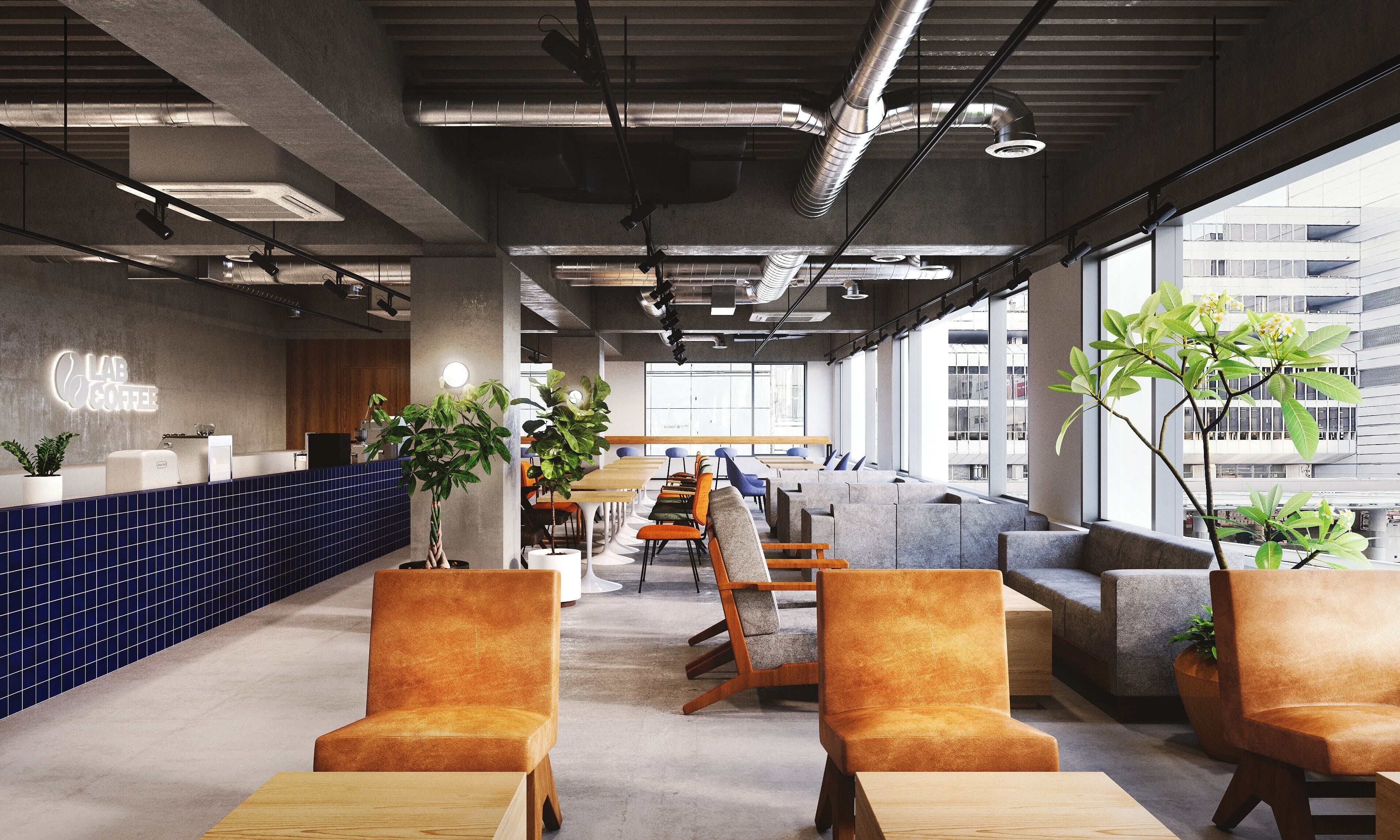 約1,000㎡超のワンフロアに、シェアオフィス・ラウンジ・カフェを備えた複合型ワークスペースです。